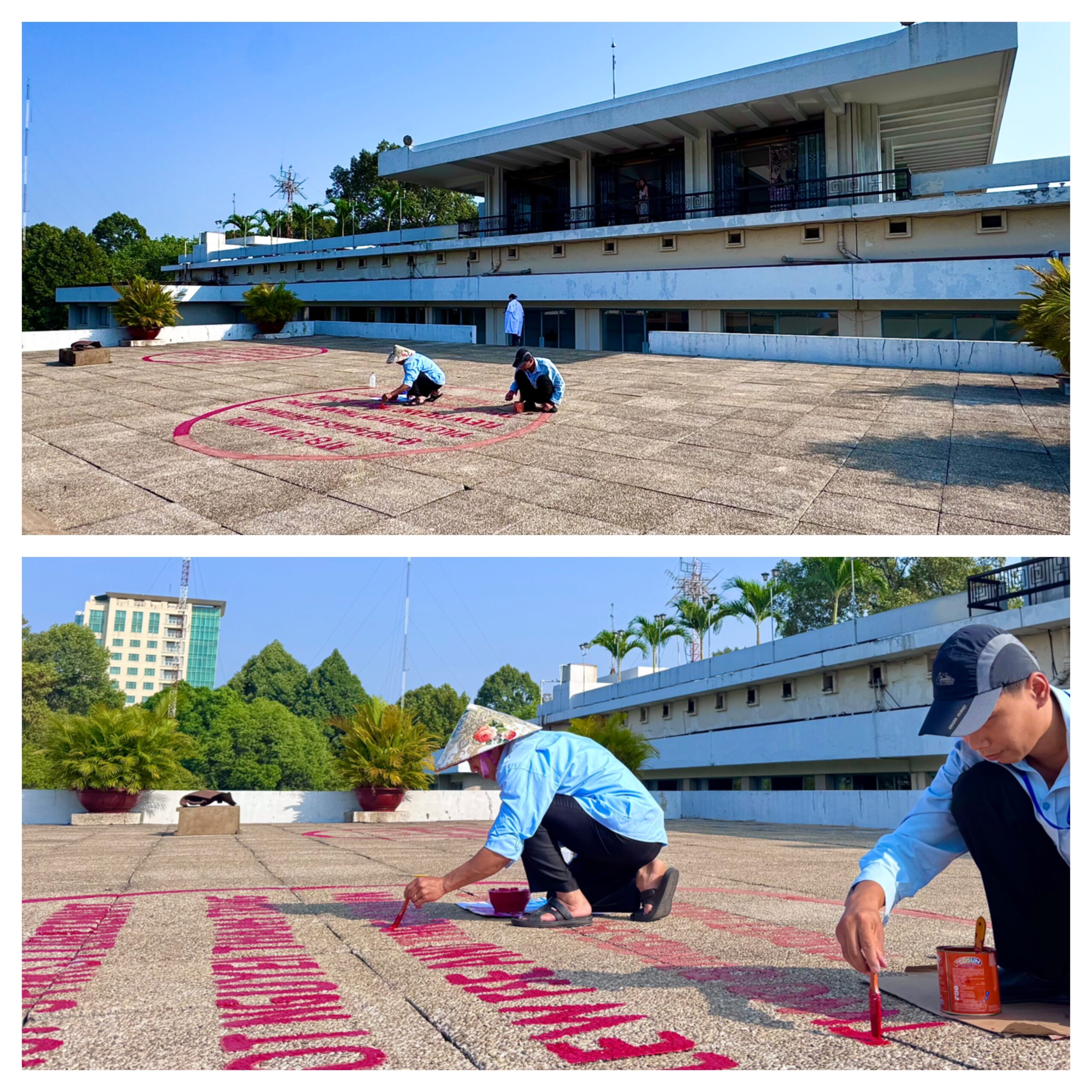 Hình 2: Nhân viên Hội trường Thống Nhất đang sơn lại phần chữ chú thích trên sân đáp trực thăng.