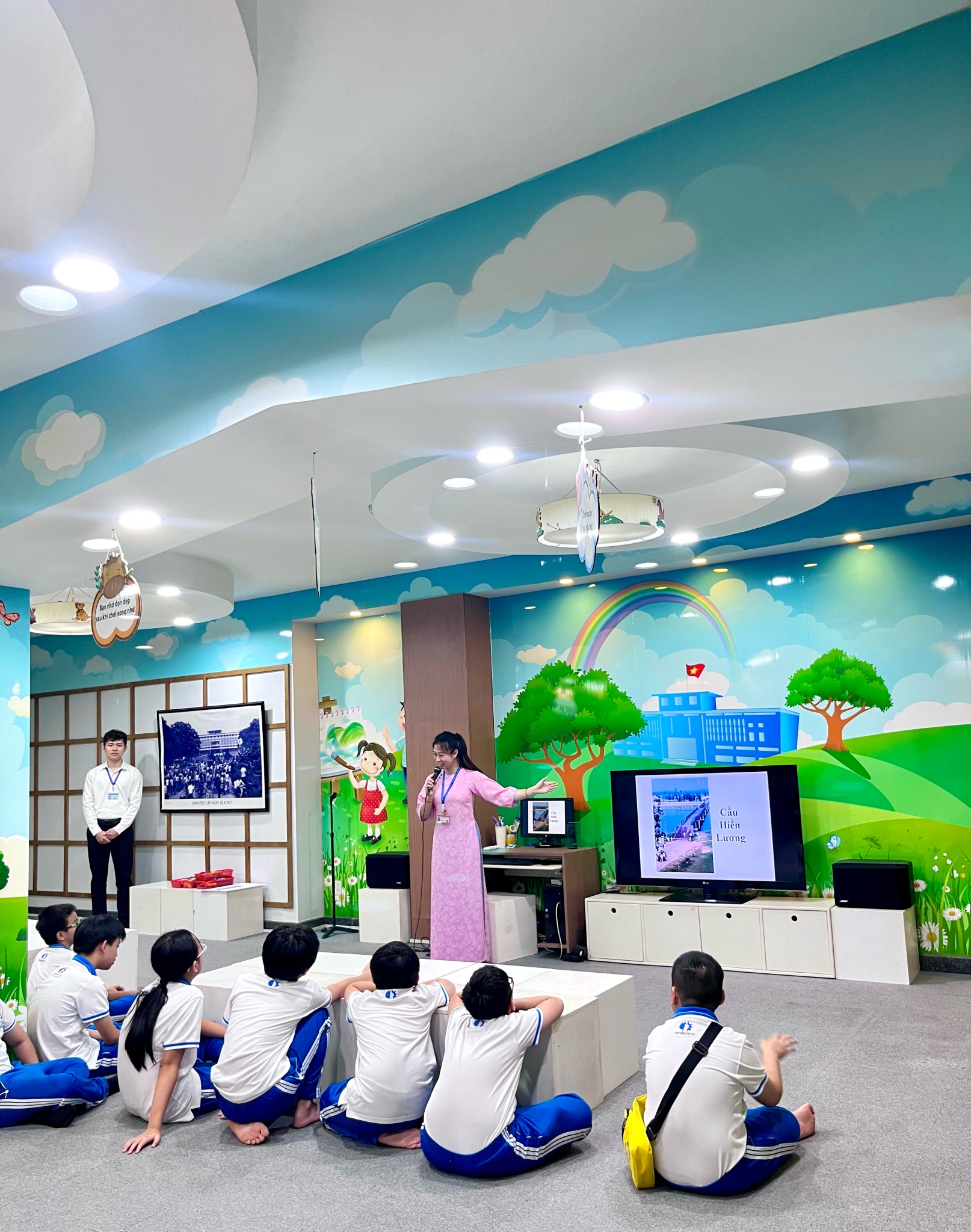 Hình 4: Các em trường Vstar nghe giới thiệu sự kiện qua hình ảnh