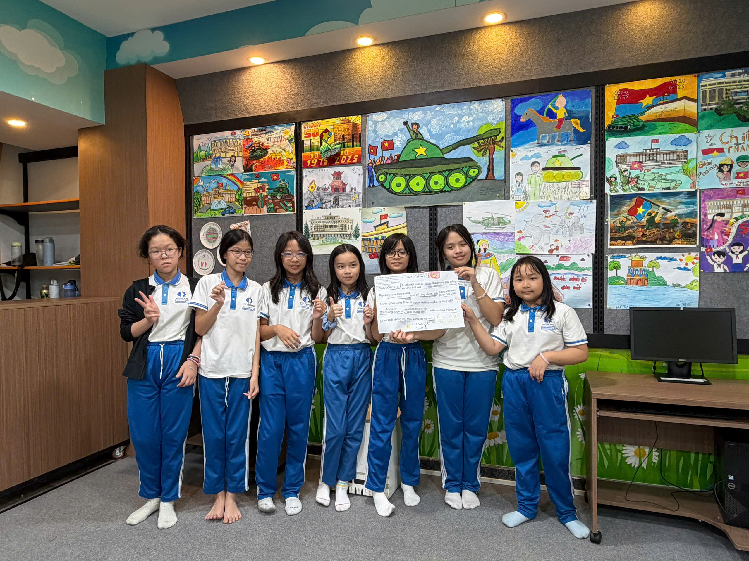 Trong 90 phút của buổi học, các em không chỉ được quan sát trực tiếp, lắng nghe câu chuyện gắn liền với hiện vật mà còn được tham gia các hoạt động trải nghiệm như giải câu hỏi liên quan đến ngày 30/4/1975, sáng tạo tác phẩm nghệ thuật bằng nhiều màu sắc.