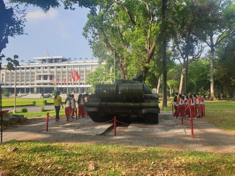 Bên 02 chiếc xe tăng số hiệu 843 và 390 trong khuôn viên Di tích lịch sử Dinh Độc Lập, 30 học sinh lớp 5 trường Tiểu học Nguyễn Thái Học, Quận 1, TPHCM, cùng say sưa tìm hiểu câu chuyện “Tiến vào Dinh Độc Lập” khi tham gia chương trình “Khám phá Di sản” tại Câu lạc bộ trẻ em, sáng ngày 20/01/2021. Say sưa với các câu chuyện và hào hứng vẽ tranh