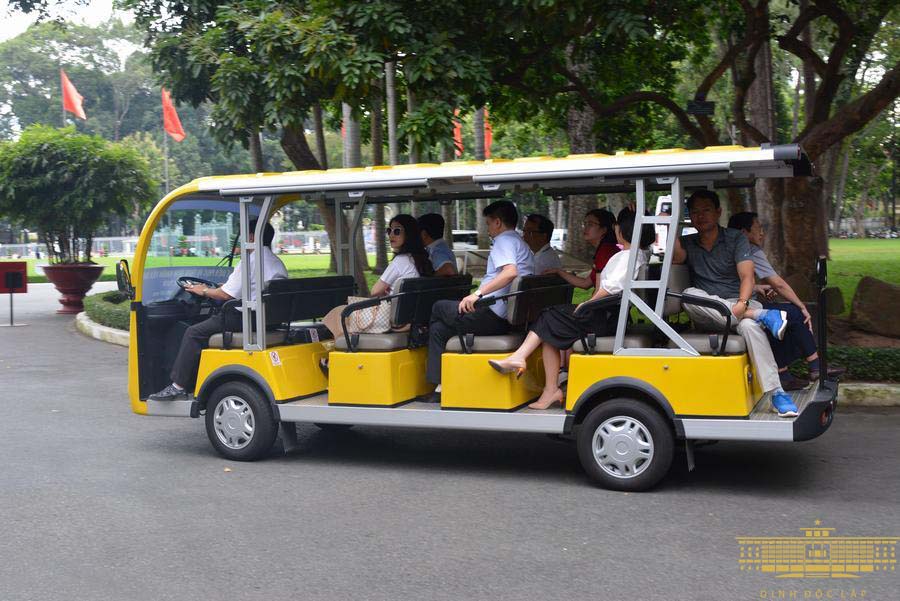 Đoàn tham quan khuôn viên di tích lịch sử Dinh Độc Lập bằng xe điện