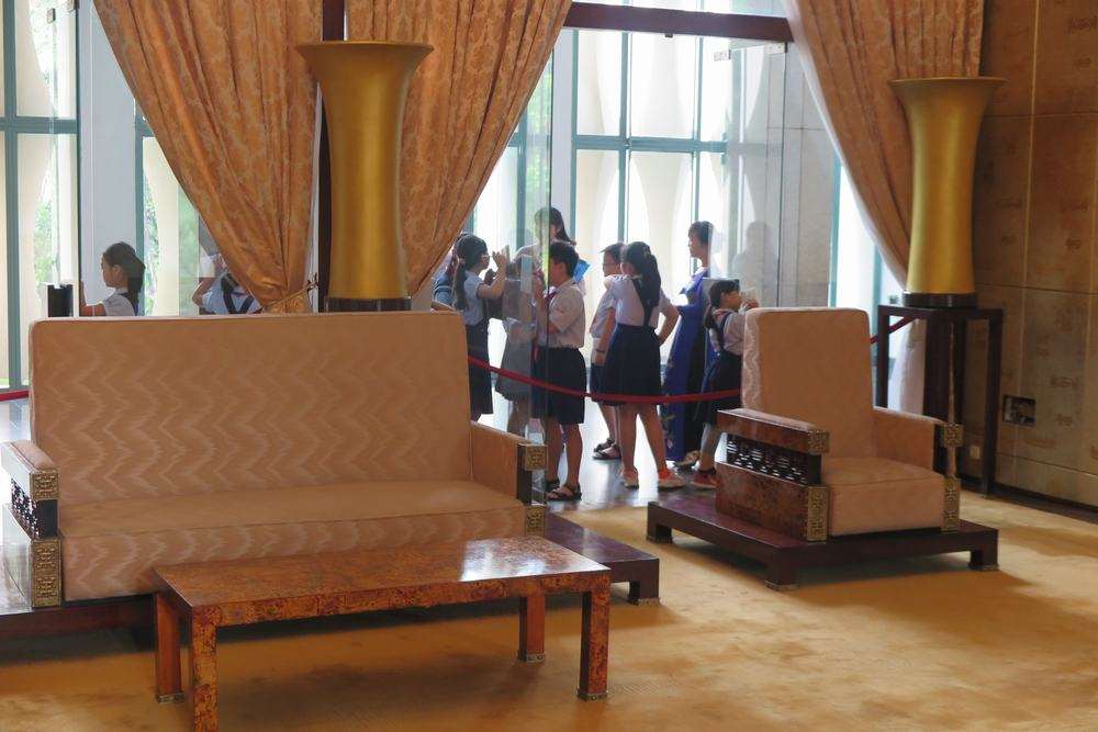 Studying the lacquer painting “Famous Vietnamese Manifesto” at the Ambassador Chamber, Independence Palace historical relic