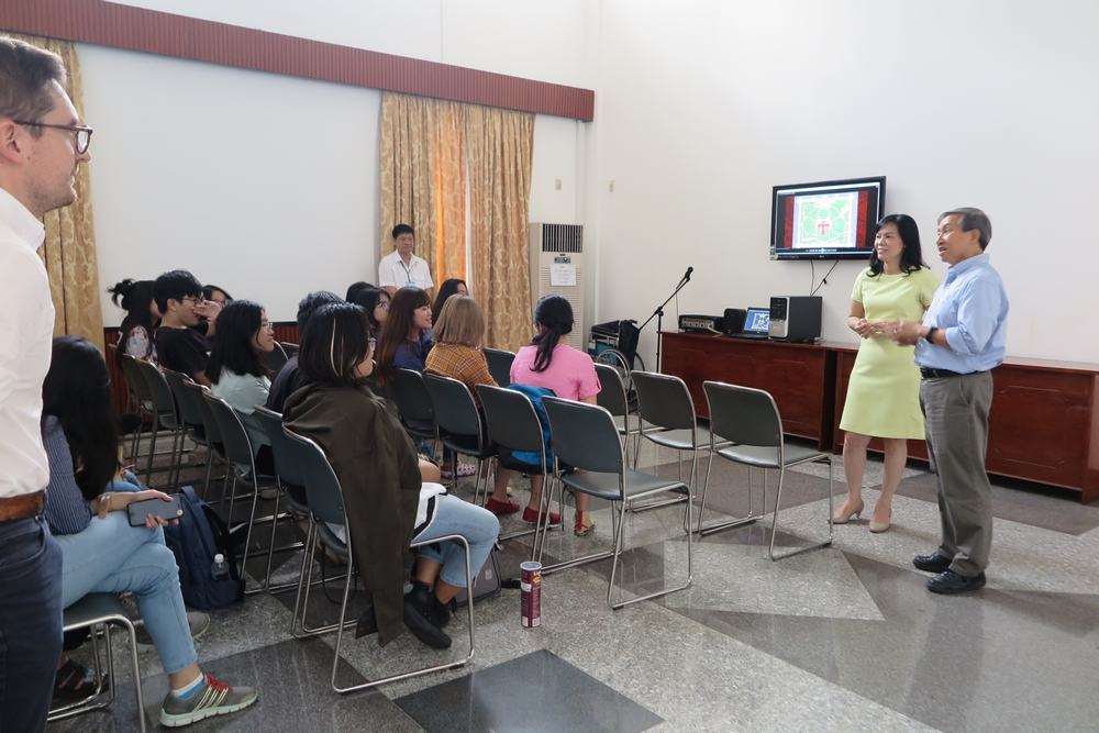 Director of Unification Hall, Tran Thị Ngoc Diep talks to the students