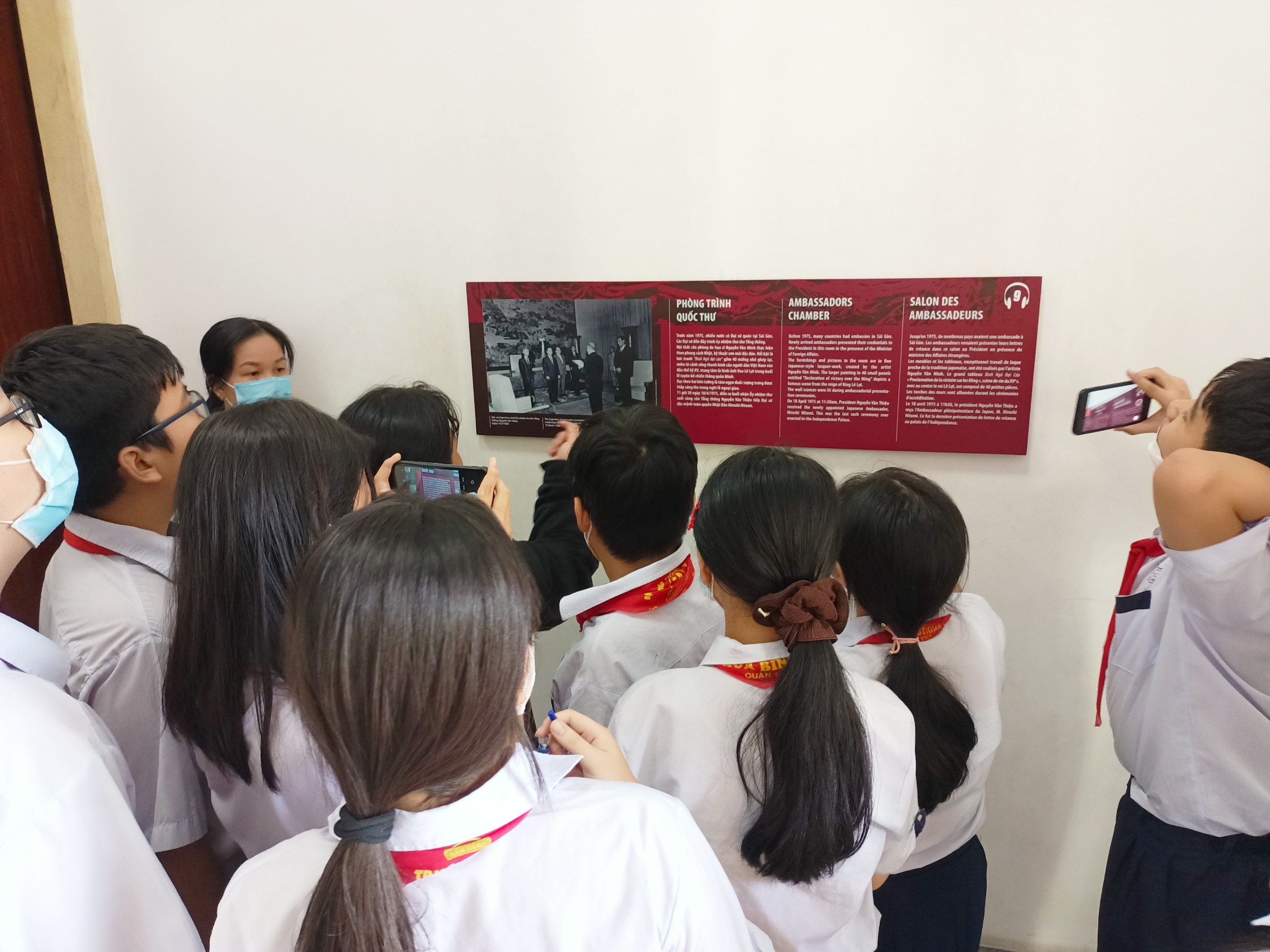 Trong 02 ngày 18 và 19/10/2022, tại Câu lạc bộ Trẻ em, Hội trường Thống Nhất, gần 300 học sinh khối lớp 7 trường Võ Trường Toản, Thành phố Hồ Chí Minh đã đến tham gia buổi học ngoại khóa, cùng tìm hiểu các giá trị văn hóa, lịch sử và mỹ thuật thông qua việc tìm hiểu về bức tranh sơn mài “Bình Ngô Đại Cáo” trong Di tích lịch sử Dinh Độc Lập.