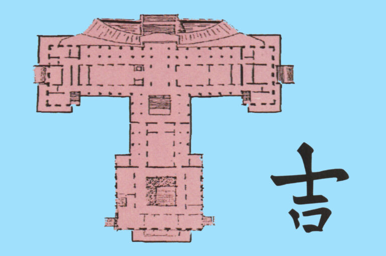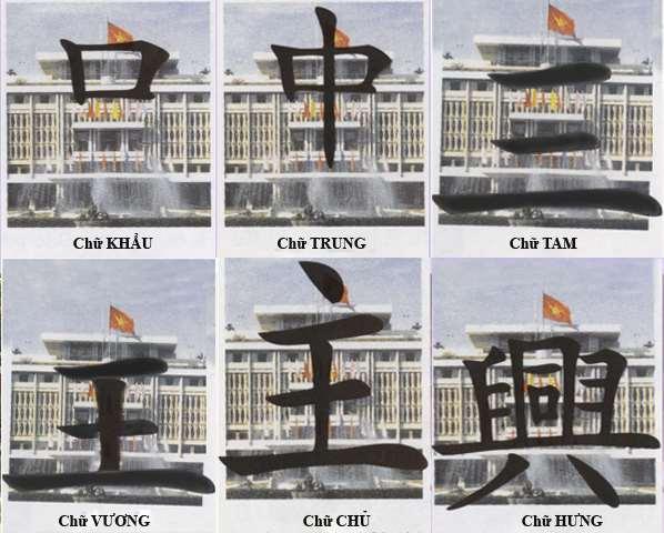 Các đường nét mái hiên và ban công tạo thành hình chữ TAM (三), gợi quan niệm “dân chủ hữu tam”: Nhân – Minh – Võ, mong muốn đất nước phát triển dựa trên những con người đủ phẩm chất, trí tuệ và bản lĩnh. Ba nét gạch ngang kết hợp với nét sổ dọc hình thành chữ VƯƠNG (王); thêm kỳ đài phía trên tạo nên hình chữ CHỦ (主), tượng trưng cho chủ quyền quốc gia. Toàn bộ mặt tiền với ban công tầng 2, tầng 3, mái hiên và hai cột gỗ tạo thành chữ HƯNG (興), mang ý nghĩa cầu chúc quốc thái dân an, đất nước hưng thịnh.