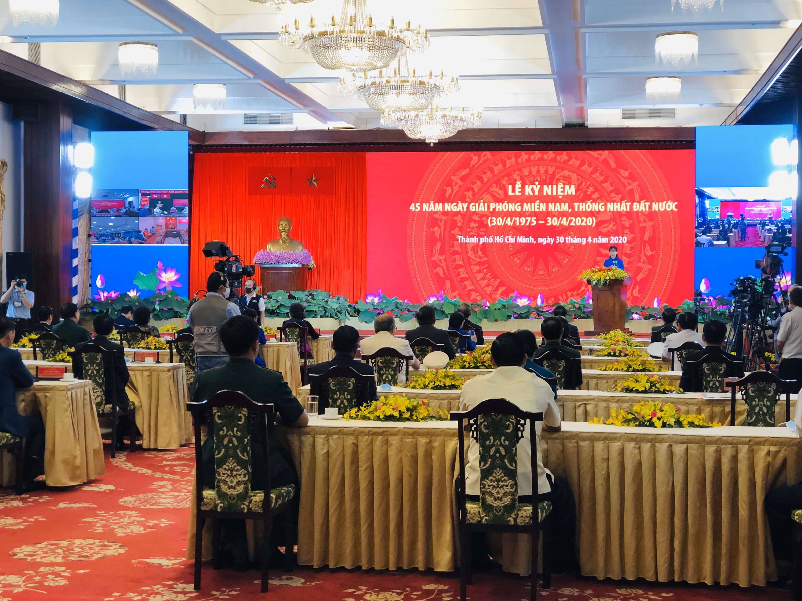 Sáng 30/4/2020, tại phòng Khánh Tiết, Hội trường Thống Nhất, Lễ kỷ niệm 45 năm Ngày Giải phóng miền Nam, thống nhất đất nước đã được Thành ủy, Hội đồng nhân dân, Ủy ban nhân dân, Ủy ban Mặt trận Tổ quốc Việt Nam Thành phố Hồ Chí Minh tổ chức long trọng và truyền hình trực tiếp.