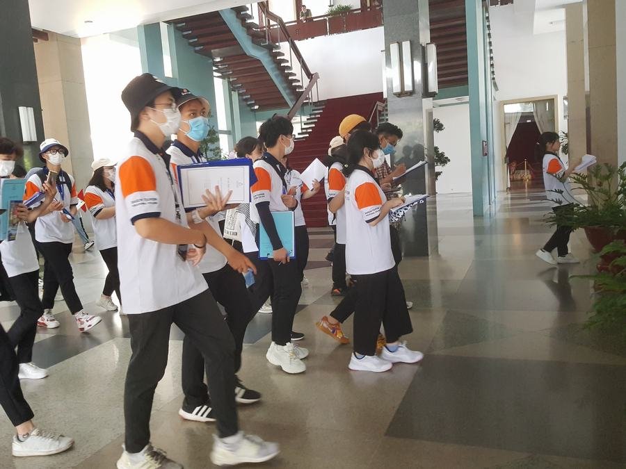 Các sinh viên chăm chú từng chi tiết trưng bày trong Di tích lịch sử Dinh Độc Lập